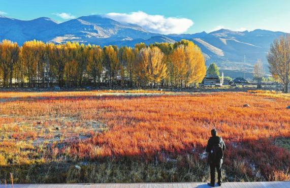 稻城亚丁红草地湿地公园 水蓼草甸在蓝天白云映衬下美不胜收