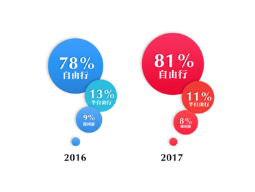 出境游游客年龄构成 “爱自由、够洒脱、重体验、舍得花”,可谓是对年轻出境游客的特征总结。 “爱自由”早已是年轻群体的标签,81%的他们更愿意以自由行的方式出境旅行。与此同时,在游玩方式上,“乐高组件式”预订越来越受青睐,租车在境外自驾游的游客,2017年比2016年上涨了337%,简直比自由更自由。