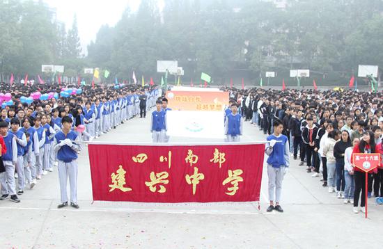 四川新闻网南充频道10月20日讯(曾森林) 青春的脚步,快如金秋之风;绽放的笑容,灿若春晓之花。10月19日上午,幸福山下薄暮寥寥,宛若仙境。 操场上彩旗招展,激情飞扬。南部县建兴中学第28届秋季田径运动会隆重开幕。 行政办公室主任杜明亮主持开幕式入场仪式。 踏着激昂的运动员进行曲节拍,国旗队、彩旗队、运动员代表排列着整齐的方阵,在旗手的引领下,依次有序地走过主席台。运动员们精神抖擞、斗志昂扬,用醒目的横幅、矫健的步伐、响亮的口号展现了健康向上、团结进取、奋勇拼搏的精神风貌,也展示出建中学子特有的朝气与活力。灿烂的笑容抒写着他们的热情,激昂的口号透露出他们的坚定,是他们让我们相信奋斗造就辉煌,是他们让我们相信心有多大,舞台就有多大。  | | 开幕式现场(曾森林供图) |