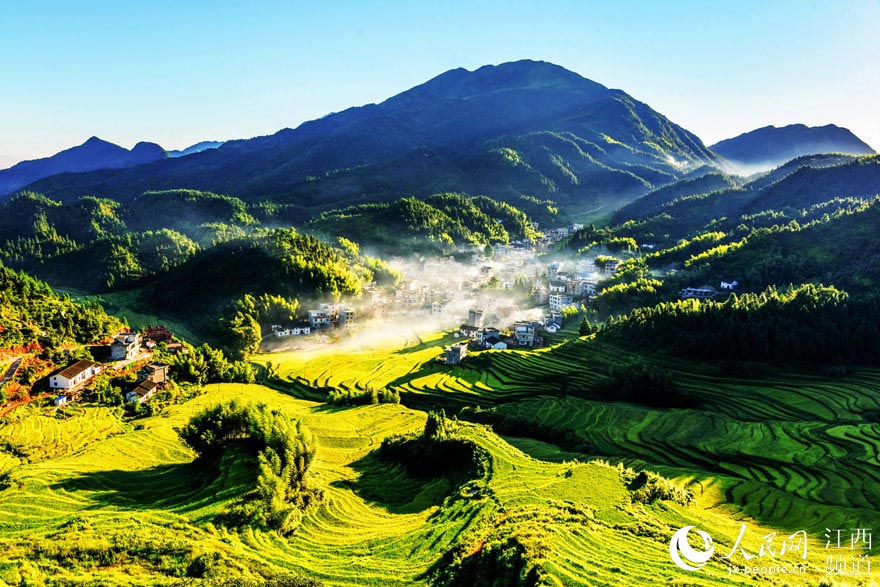 人民网南昌10月27日电 金秋十月的江西遂川梯田,漫山“铺金”,层层梯田若级级金阶,梯田环绕的山峰又似座座金塔,山坡高耸,一层层的田地仿佛是直达天际的阶梯,曼妙的曲线成了大山的“指纹”。 据了解,江西省遂川县的高山梯田具有“中国最美梯田之乡”的美称。这里群山环绕,耕地稀少,勤劳的客家人因地制宜开辟出适合耕种的梯田。 在这里,凡有水源的地方都可开垦梯田种植水稻,拥有极高森林覆盖率的大山形成了一道天然的屏障。层层叠叠的梯田是线条和色块的完美组合,站在高处望去,梯田成为抽象的风景画。金秋十月,恰是收割时节,梯田与劳作的人共同组成了一幅幅精美的图画。(时雨 谢月明 肖远泮) 原标题:江西遂川:金秋时节梯田美