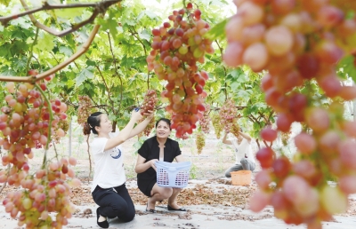 | | 游客在彭家乡伴闲山庄葡萄园采摘成熟的葡萄。 |
