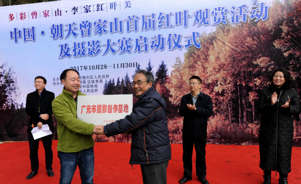 看万山红遍,层林尽染……10月28日,中国•朝天曾家山首届红叶观赏活动及摄影大赛在李家乡拉开帷幕。活动吸引了多家媒体、500余名摄影和运动爱好者前来参加。 锣鼓敲起来、狮子舞起来!开幕式上,锣鼓、狮舞等极具地方特色的民俗文化节目精彩上演,使本已爆棚的人气愈发高涨。仪式上,还举行了广元市摄影家协会野外拍摄基地授牌。 当天,天气晴朗,林中透进屡屡阳光,清新的空气、醉人的美景,令人心旷神怡。参加重阳节登山活动的爱好者,沿着“李家嘴—望远山顶—石笋坪—仓库坪”线路,登山爱好者在望远山腹地穿行,来回行程达3公里。 “今天是周末嘛,带着孩子来这里锻炼锻炼,找找在曾家山深呼吸的感觉。”来自广元城区的何海一边擦着汗一边指着身边的小女孩说,登山之后,他还要带着女儿看看红叶,感受一下多彩曾家山深秋美景。 最眷恋红叶美景的,非摄影爱好者莫属。在广袤缤纷的红叶中,散布着他们的足迹。“今年来曾家山已是第五次了,这里不愧为全国十佳红叶观赏地,我想做又能做的,就是用镜头记录曾家山。”在老林村落叶松山林里,摄影爱好者吴雪松被美轮美奂的红叶迷住,越拍兴致越浓。  | | 野外拍摄基础授牌仪式 |