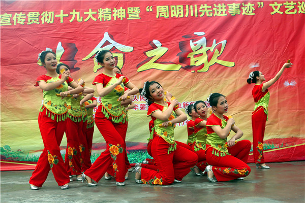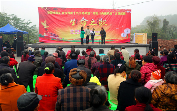 四川新闻网广安11月29日讯(杨天军 文/图)11月25日,广安华蓥市委、市政府在观音溪镇高坪村巡演了华蓥市脱贫攻坚周明川先进事迹的情景剧《生命之歌》;乡亲们含着热泪看完了这部情景剧。 广安华蓥市把学习宣传贯彻党的十九大精神与脱贫攻坚工作 学先进赶先进有机结合起来,将因积劳成疾引发疾病牺牲在脱贫攻坚第一线的“优秀共产党员”周明川的先进事迹,以“生命之歌”为主题编排成文艺节目,宣传队于11月25日走进高坪村巡回演出,以激励全市广大干部群众以党的十九大精神为行动指南,以周明川为榜样,积极投身精准扶贫、脱贫攻坚工作之中。  | | 快板说唱:《生命之歌 扶贫小唱》。 |