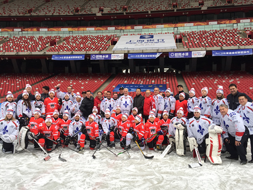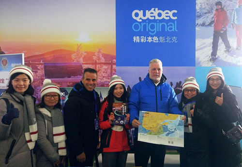 魁北克省省长与旅游局代表合影 在感受冰雪运动之余,游客还可以看到来自魁北克本土的冬季户外装备展出,雪服、雪具、冰球棒、冰鞋、面具等各色冰雪用品应有尽有。除此之外,现场还有枫糖棒棒糖、烤棉花糖、热苹果醋等魁北克传统美食带来从舌尖到心头的暖意。
