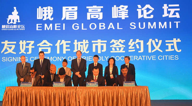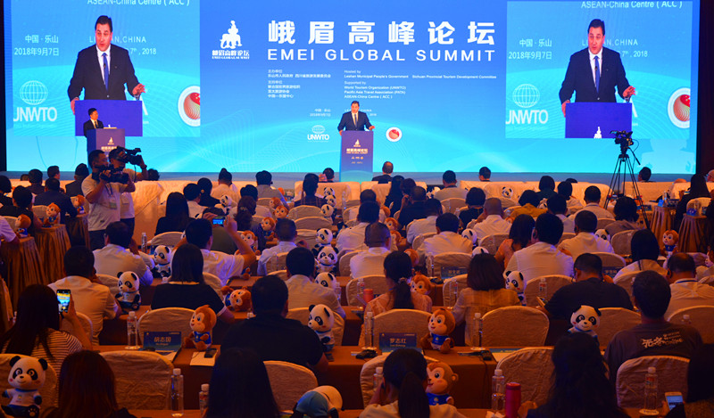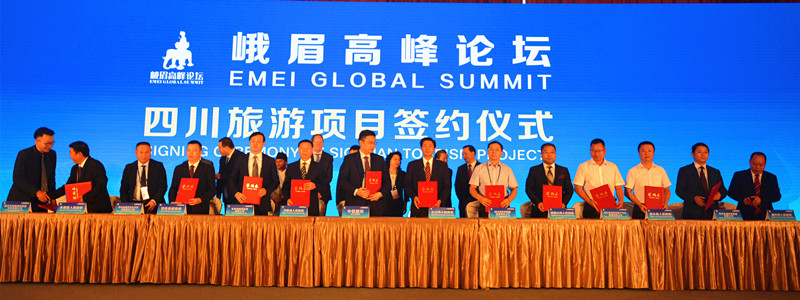 亚太旅游协会主席克里斯·鲍萃尔,尼泊尔国家文化旅游民航部部长拉宾德拉·阿迪卡里先生,联合国世界旅游组织成员关系部主任贝克·加克里,中国—东盟中心秘书长陈德海,亚太旅游协会首席执行官马里奥·哈迪,中信国安集团有限公司董事长、党委书记夏桂兰,四川省旅游发展委员会党组书记胡斌,乐山市委副书记、市长张彤,副市长周伦斌、廖克全出席论坛。市委副书记田文主持论坛。 本次峨眉高峰论坛主题为“美好生活引领优质旅游”。在主题演讲环节,亚太旅游协会主席克里斯·鲍萃尔、著名导演王潮歌、南开大学旅游与服务学院院长邱汉琴、灵山文化旅游集团董事长吴国平分别作了主题演讲。 论坛会上,举行了第五届四川国际旅游交易博览会旅游项目集中签约仪式,签约项目共计18个,签约金额713.7亿元,涉及旅游度假区、旅游民宿、旅游小镇、动漫项目等。其中,东道主乐山市共签约项目12个、签约金额517.2亿元,资阳、泸州、眉山、宜宾、攀枝花、南充等6市签约项目6个、签约金额196.5亿元。 论坛上还举行了《神秘的大佛之护宝联盟》发布仪式和友好合作城市、友好景区签约仪式。乐山市与尼泊尔坦森市、拉姆拉姆市、蓝毗尼文化市缔结为友好合作城市,乐山大佛景区与尼泊尔蓝毗尼圣园缔结为友好景区。