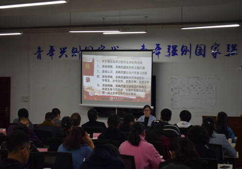 王春梅从报告起草形成过程背景、总体结构等六个方面对学校第二次党代会报告进行了宣讲,重点围绕“3748”,即报告的三大结构、学校过去六年工作的“7个更加”、进入新时代的“4个明确”、建设应用型一流大学的“8个根本举措”做了详细阐述。 人文社科学院院长文忠波表示,人文社科学院全体师生将认真学习学校第二次党代会精神,结合学院实际,在目标计划中努力奋斗,在奋斗中收获幸福感。他要求,在接下来的工作中,人文学院全体教职工要做到与学校党委思想高度统一,深入学习,真抓实干,重新思考对学生的要求与定位,把精力投入教学科研与社会活动中去;全面提升"师能",抓住学生的时间,真正让学生学有所获,力争以切实行动提高政治站位,确保学校第二次党代会精神的学习宣传工作落到实处、取得实效。