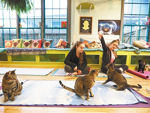 美国休斯敦一家猫咪咖啡馆定期举办猫咪瑜伽课程,有趣的形式吸引了众多消费者。有瑜伽学员说,比起一般瑜伽课,和猫咪一起做瑜伽不仅有趣,而且更放松。图为学员在课程开始前和猫咪玩耍。 (新华社发)