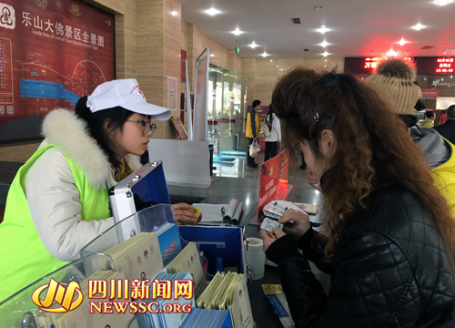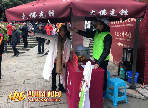 大佛先锋志愿者工作中 四川新闻网乐山2月10日讯(蒲晓君 文/图)2019年春节黄金周期间,来自五湖四海的游客汇聚古城乐山,旅游市场火持续爆,为了更好地为市民及游客提供旅游出行便捷服务,提升游客旅游体验,乐山大佛、峨眉山景区特设立了暖心服务队、服务点,深入景区、公路、车场、车站等一线,为游客提供旅游咨询、应急医疗、文明劝导、行李寄存等贴心服务,让游客宾至如归。