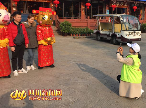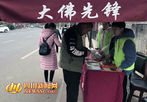 大佛先锋为游客拍照 大佛先锋服务队不仅提供咨询服务,也急游客所需,及时为游客排忧解难。大年初三下午两点左右,几位来自泸州的游客向集凤楼的志愿者求助,一位老人走失,老人不识字,身上也没带手机,家属焦急万分。接到求助后,志愿者们马上展开行动紧急寻人,大家把老人的照片传到志愿者微信群,火速展开人肉搜索,并通知集凤楼监控中心广播寻人。经过大家的不懈努力,一个小时候之后,走失的老人被找到,老人的孩子和家属见到走失1个小时的老人安然无恙,激动地拉着志愿者的手,连声道谢。 看到大佛先锋志愿者们在景区忙碌的身影和乐于助人的笑脸,广大游客和市民纷纷为他们点赞,并把他们称之为景区的“小太阳”,他们暖心的服务就像阳光一样照进了市民和游客的心里。 大佛先锋志愿者 据大佛先锋服务队相关负责人介绍,“大佛先锋”是以乐山大佛景区、派驻机构、市中区大佛街道、九峰镇共产党员、共青团员、干部职工为主体组成的志愿服务队伍。每逢节假日,大佛先锋志愿者就会出现在景区游客中心、讲解服务中心、八仙洞码头、北门、佛头、临江阁、麻浩崖墓等游客集中区域“大佛先锋”服务站,配备热水、常用药、雨衣、景区游览路线图(宣传册)、轮椅、婴儿车、雨伞等游客常需服务品,为游客提供温暖的服务。