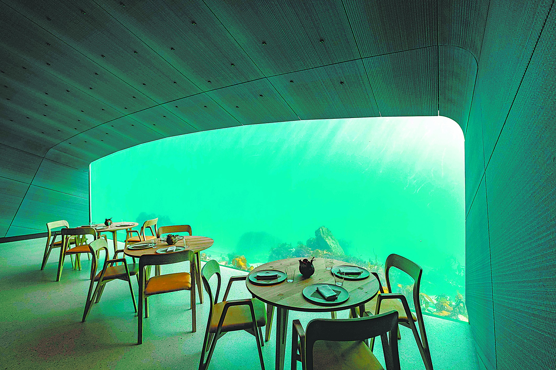 这家餐厅名为Under(意为“下面”),在挪威语中,该词又与“奇观”同义。餐厅名副其实,是在“下面”,这家餐厅向海面下延伸了5米,客人可以在享受美食的同时,体验被海底生物环绕的神奇感受。该餐厅是目前欧洲第一家、也是世界最大的一家“海底”餐厅。