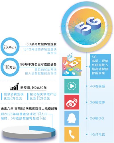 2018年,我国信息消费规模约5万亿元,成为有效拉动内需、助力经济平稳增长的重要引擎。信息消费带来哪些新业态?在快速发展中出现哪些新问题?对制度供给提出哪些新要求?本版推出“大数据观察·关注信息消费”系列报道。 ——编 者 自动起步,均匀提速,遭遇前方慢车自动变道超车,沿着道路标志线自动转弯,自动识别交通信号标识和限速标志,在红灯前自动刹停,探测到前方行人自动避让……日前,在宁波杭州湾一段封闭道路上,记者乘坐吉利汽车研究院自主研发、基于5G和车路协同技术的无人驾驶出租车ROBO Taxi平稳行驶了2.5公里。 不只是自动驾驶,从深圳的5G警务执法,到成都的5G立体交管和智慧公交,从黄山的5G+VR旅游,到广东省第二人民医院的5G手术直播……随着各地5G试验网络的搭建,5G技术已在社会生活的方方面面进行应用探索。6月6日,工信部向中国电信、中国移动、中国联通、中国广电发放5G商用牌照,标志着我国正式进入5G商用元年。 万物互联,人机交互新体验 一秒钟下载一部高清电影……提到5G,其传输速率之快可谓尽人皆知。那么,5G到底有多快? 5G国际标准制定组织3GPP给出的答案是:最高数据传输速度达到20Gbps,这比4G网络的传输速度快数百倍。 与4G相比,5G可以支持最多192个天线,加上更大的频率带宽、更广的频率范围,带来更高的用户数据传输速率和更大的网络容量,可以满足增强现实、虚拟现实、裸眼3D视频等超高速率业务的传输需求,用智能终端分享3D电影、游戏以及超高清节目的时代已向我们走来。 “与4G相比,快只是5G的优势之一。万物互联,才是5G与4G最大的不同。”中国移动研究院刘光毅研究员说,通过网络的虚拟化和软件定义,5G每平方公里可连接100万台设备,是目前移动网络接入设备数量的近百倍,一张网络就可满足未来企业级应用和垂直行业应用的差异化业务需求,从而实现从消费到生产的全环节、从人到物的全场景覆盖,这就是万物互联。 “全世界高度关注5G的根本原因是,作为经济社会数字化转型的一个关键基础设施,5G将对消费、生产领域,特别是生产领域产生深远影响。”工信部新闻发言人、信息通信发展司司长闻库认为,5G将开启万物互联、人机交互的新时代,工业、交通、医疗、能源、智慧城市、智能家居等,都将随着5G的融合擦出新的火花,进而带动产业和社会变革,对构筑数字化时代国家竞争新优势意义重大。 场景丰富,身临其境应用广 看过电影《头号玩家》的人们,一定会对银幕上真实感爆棚的虚拟现实游戏“绿洲”心动。腾讯生态安全研究中心高级研究员翟尤告诉记者,5G带来画质分辨率、渲染处理速度、网络传输速率的全面提升,将与超高清显示、增强现实、虚拟现实、裸眼3D视频等技术一起,推动用户交互方式再次升级,《头号玩家》中身临其境般的体验并不遥远。 “增强型移动宽带支撑的超高清视频、VR游戏,只是5G三大应用场景之一。”翟尤说,5G的海量物联网通信功能,不仅能够将医疗仪器、家用电器和手持通信终端等全部连接在一起,还能面向智慧城市、环境监测、智能农业、森林防火等以传感和数据采集为目标的应用场景,提供具备超千亿网络连接的支持能力。 5月14日,四川大学华西医院运用中国电信提供的5G网络技术,与四川大学华西医院龙泉医院、遂宁市中心医院连线,进行了多地联合远程会诊及实时纤维支气管镜手术演示指导。这也是全国首次将5G网络运用到多地医疗会诊和手术指导。此前,中国电信协同广东省第二人民医院完成了5G手术直播,助力安徽省立医院实现远程救护,打造移动ICU。 5G能够提供毫秒级的端到端时延和接近100%的业务可靠性保证,为无人驾驶、工业互联网的普及提供网络支撑。通过5G网络,工人可以在位于上海的模拟驾驶室里,操作一台远在石家庄施工工地的挖掘机进行挖掘作业……在2018年上海世界移动大会上,中国移动演示的5G智慧工业应用场景,只是工业互联网的典型应用之一。据全球移动通信协会(GSMA)预测,2017年到2025年之间,工业联网设备连接数将增长100.75亿个。5G在工业领域的广泛应用,将有效提升网络化系统制造水平,促进企业提质增效。 贴近市场,调动行业积极性 “什么是5G?我们说了不算,用户说了算。用户不认可的5G,不是真正的5G。”4月26日,在深圳举行的中国电信5G创新合作大会上,中国电信集团董事长柯瑞文宣布,全球第一张混合组网的5G跨域规模试验网开通。 相对于目前4G使用的中低频,5G在中高频及毫米波频段的速度和带宽上具有天生的优势,但是中高频段对墙体、地板等固体障碍物的穿透能力差,传输距离短,信号覆盖弱,给5G组网带来了不小的挑战。 据报道,在全球第一个实现5G商用的国家韩国,5G服务出现了网络信号不够稳定、覆盖范围小、网络接入困难、信号质量差等一系列问题。业内专家表示,5G离不开基站的高密度覆盖,在商用初期,任何国家都难以快速实现基站的大规模部署。此外,5G终端品种少、价格高,5G应用不够丰富等问题,同样会让“尝鲜者”的用户体验打折扣。 闻库介绍说,正如当年4G建设那样,5G一定也是从热点地区、需求热的地方率先启动。目前我国已经完成5G技术研发关键技术验证、技术方案验证、系统验证三个阶段验证工作,但是5G一夜之间像4G覆盖那么好,也不太现实。 “建得好不是5G的目的,用得好才是5G真正的目的。”闻库