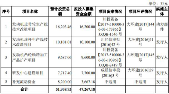 对于2019年上半年业绩变动原因,西菱动力表示,报告期内,中国汽车行业景气度持续下降,产销量同比继续下滑,公司对部分主要客户的销售收入同比减少。 西菱动力上市时披露的公告书显示,公司以每股12.90元的价格发行4000万股,募集资金总额为5.16亿元,扣除发行费用后募集资金净额4.72亿元。其中,1.62亿元用于发动机皮带轮生产线技术改造项目;1.01亿元用于发动机连杆生产线技术改造项目;9600万元用于发动机凸轮轴精加工产品扩产项目;7700万元用于研发中心建设项目;3667.18万元用于补充流动资金。