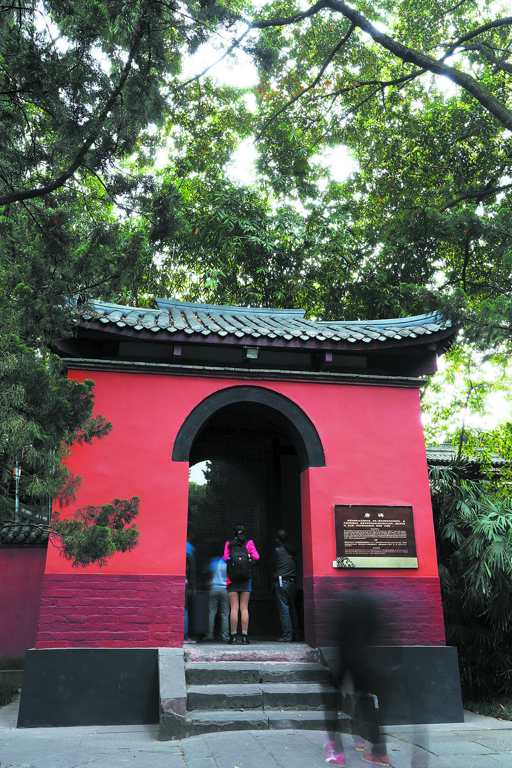 诸葛亮塑像 游客参观三绝碑 武侯祠博物馆 作为首批全国重点文物保护单位,成都武侯祠博物馆是成都的城市名片,几乎到成都的游客都会前往武侯祠游览。但还没走进大门口,你可能就会心生疑惑:我莫不是走错了吧,为何门口匾额上书的是“汉昭烈庙”? 一陵、一庙、一祠巍然并列,合而为一,此乃成都独创。作为民族智慧化身的诸葛亮,赢得蜀地百姓千百年的尊崇。智慧而又勇于创新的成都人,在这里开创了中国历史上帝王陵、庙与臣祠三者同享祭祀的特例。 城市名片 武侯祠文化底蕴深厚悠远 来成都旅游,相信武侯祠博物馆是大家不可或缺的打卡地。这里三国文化源远流长,文化底蕴深厚悠远,天府文化的根脉和记忆深植其中。 虽然身处闹市,武侯祠博物馆门口的两座饱经风霜的石狮子巍然肃穆,一下就能把人的思绪拉进风云变幻的历史中。站在大门口抬眼望去,你会发现,牌匾上镌刻的并非是想象中的“武侯祠”,而是金字刻就的“汉昭烈庙”(“昭烈”是刘备的谥号)。即使馆外艳阳高照,一进入武侯祠博物馆,记者整个人就沉静下来。这既因为茂林修竹间的凉爽,也源于武侯祠内扑面而来的古朴气息。 武侯祠主体建筑分为大门、二门、刘备殿、过厅和诸葛亮殿五重。大门至二门之间的道路两侧,首先映入眼帘的就是唐、明、清各代石碑,这些高高耸立的石碑满是历史的印记,向游人赞述着三国蜀汉英雄的业绩和古祠的沧桑。沿着中轴线一路往前,记者来到了汉昭烈庙。站在汉昭烈庙前抬眼望去,对面气势威严的大殿正中,刘备正襟危坐。而两侧的偏殿中,一尊尊端庄的塑像静穆地坐着。武侯祠博物馆的特级讲解员李志告诉记者,这些塑像都是清代康熙至道光年间的泥彩,东廊文臣,西廊武将,庞统、赵云等蜀国名臣端坐。身处其间,记者仿佛穿越到了蜀汉的一次廷议,踌躇满志的皇帝刘备正与大臣们处理国事。想到此,忍不住让人想侧耳倾听他们究竟谈了些什么。 “对于海内外的游客来说,我们整个博物馆都被称作武侯祠,而这里才是祭奠诸葛亮的地方——武侯祠。”李志一边介绍,一边带着记者穿过汉昭烈庙后的过厅,悬挂着一块格外醒目的匾额“武侯祠”会提醒你,这才是祭奠诸葛亮的武侯祠。殿堂内,供奉着诸葛亮祖孙三代的贴金泥塑坐像。诸葛亮居中,羽扇纶巾、凝目沉思,神态怡然自得。而在他面前,一路上不断张望的游客纷纷驻足停留,极其郑重地向诸葛亮塑像鞠躬。眼前的情景让人不得不感慨诸葛亮的声望之高,受到的崇敬之深。 诸葛亮治蜀受爱戴 全国唯一君臣合祀祠庙形成 明明大门上写的是“汉昭烈庙”,为什么老百姓都管这里叫武侯祠?这要从我们都熟知的三国历史说起。东汉末年分三国,烽火连天不休。在那个英杰辈出,群雄并起,烽烟遍地,革故鼎新的时代,成都据天时地利人和,成为乱世之中难得之固土,这与刘备和丞相诸葛亮有不可分的关系。 刘备攻取成都并未造成大的破坏,蜀汉建国后,以成都为都城。登基两年后,刘备就在白帝城去世。辅佐幼主的诸葛亮通过一系列政治和经济措施,使得蜀地在三国战乱岁月中,“田畴辟,仓廪实,器械利,蓄积饶,朝会不华,路无醉人”,一派欣欣向荣景象。武侯祠博物馆工作人员介绍说,治蜀过程中,诸葛亮认为都江堰“此堰农本,国之所资”,组织专门队伍负责都江堰的维修和保护工作,并完善引水入城的河渠系统,保障了成都平原高度的灌溉水平。“锦官城”之名的由来,也与诸葛亮密切相关。他将蜀锦视为国家战略物资,允许官办、商办、家庭等经济体从事蜀锦生产,同时在成都置“锦官”,以集中织锦工匠,管理织锦。“这座‘锦官城’是我国历史上织锦行业最早的‘国家产业化示范园区’,后来慢慢演变为成都美好的代称。诸葛亮还发展盐铁、崇文重教、南征北伐。在他治蜀期间,蜀地政治清明、经济发达、人民安定。在诸葛亮的治理下,成都得以稳定发展,成为‘既崇且丽’的大都市。” 234年,积劳成疾的诸葛亮病逝于五丈原。当他逝世的消息传回蜀中,举国哀痛。蜀中士民深深缅怀这位曾经给蜀地带来过繁荣安定的一代贤相,想要为他修建祠堂,以此纪念。据了解,成都历史上就曾经有过七座武侯祠,清代甚至出现过四座武侯祠并存的情况,这在全国是绝无仅有的。成都最早修建的纪念诸葛亮的孔明庙在少城内。现今知名的这座武侯祠出现于公元5世纪左右,是由少城的孔明庙迁来,或是后人新建,尚无史料可考。 武侯祠真正实现“君臣合祀”的格局在明代。为了将诸葛亮和刘备在一处祭奠,一个大胆的尝试产生:采取为刘备与诸葛亮各建一殿又同在一起祭祀的处理方法。明洪武二十四年(1391年),明蜀献王朱椿进行大幅度调整,他废弃掉武侯祠,重修汉昭烈庙,将诸葛亮的塑像移至汉昭烈庙内,袝祀在刘备像的东边;关羽、张飞像袝祀在刘备像的西边。他的调整使汉昭烈庙和武侯祠的功能合并于昭烈一庙,实现了“一祠同祀君臣”的格局。清朝康熙十年至十一年的重建也沿袭了这一格局,直到现在。 激励后来者奋进 丞相祠堂千百年来受拜谒 游览武侯祠,祠中的诗文书画,建筑雕塑,碑刻匾联也是不可错过的风景。诸葛亮死后,依然受到世人的崇敬和怀念。到唐代时,成都武侯祠已是一处名胜古迹,文人墨客纷纷到此拜谒,留下了无数诗章。杜甫、雍陶、李商隐、岑参、陆游等都在此留下了名篇佳作。仅