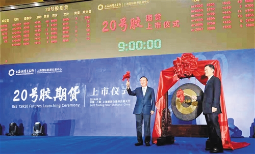 8月12日,20号胶期货在上海国际能源交易中心挂牌交易。中国证监会副主席方星海与上海市委常委、浦东新区区委书记翁祖亮共同为20号胶期货上市鸣锣。尚 期摄 上市20号胶期货,既有利于构建全球天然橡胶市场定价体系,服务我国橡胶工业发展,助力我国从轮胎制造大国迈向制造强国,服务我国天胶企业“走出去”,又有利于推进我国期货市场对外开放,扩大我国天然橡胶期货市场影响力,是服务“一带一路”倡议的有力举措—— 8月12日上午9点,我国第四个对外开放期货品种——20号胶期货,在上海期货交易所国际能源交易中心挂牌交易。证监会副主席方星海在上市仪式上表示,这是我国商品期货市场扩大对外开放、推进上海国际金融中心建设的又一重要举措。 目前,上海胶市交易规模已跃居全球之首,20号胶期货上市后,将进一步增强我国在全球橡胶市场的定价影响力。 轮胎工业技术标志 20号胶是天然橡胶主流品种之一,是轮胎产业主要基础原料。近年来,随着汽车工业蓬勃发展,我国已成为全球第一大轮胎制造国,橡胶产业结构发生了重要变化,20号胶成为全球天然橡胶产业最具代表性的品种。 全球约70%的天然橡胶用于轮胎制造,轮胎所用天然橡胶中约80%为20号胶,其重要性可见一斑。可以说,20号胶的使用已成为一个国家轮胎工业技术与工艺水平的主要标志。 从全球来看,东南亚地区橡胶种植面积和产量遥遥领先,形成了东南亚主导橡胶供应的格局。受限于地理气候环境,我国橡胶种植主要集中在海南、云南南部、广东等少数地区,产量有限。我国天然橡胶加工主要以胶园胶乳为原料,生产以SCR