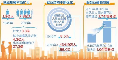 记者林火灿报道:国家统计局20日发布新中国成立70周年经济社会发展成就系列报告之十九。报告显示,第三产业已成为吸纳就业最大产业,非公有制经济成为城镇就业主渠道。 新中国成立70年来,我国就业总量从1949年的1.8亿人增加到2018年的7.8亿人,扩大了3.3倍,其中城镇就业达到4.3亿人,比1949年增加了27.3倍。 就业结构不断优化。1949年,全国城镇就业人员仅占全国就业人数的8.5%,大部分劳动者在乡村就业。2018年,城镇就业人员达43419万人,占全国就业人员比重进一步提高到56.0%,较改革开放之初增加了32.3个百分点。 第三产业成为吸纳就业最大产业。新中国成立之初,我国工业基础薄弱、服务业发展滞后,绝大多数劳动者以农业为生。改革开放以后,第三产业在1994年和2011年分别超过第二产业和第一产业,成为吸纳就业人数最多的产业。 非公有制经济成为城镇就业主渠道。2018年,城镇非公有制经济就业人员占比从1978年的0.2%提高到83.6%,其中,城镇私营企业、个体就业人员分别为13952万人、10440万人,分别占城镇就业人员的32.1%、24.0%。 原标题:城镇就业70年增加27倍 |