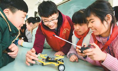 1月11日,江苏大学志愿者来到镇江市丹徒区世业实验学校,开展“留守儿童快乐学科普”活动。他们通过自己研发制作的扫地机器人、风力制造器、智能小车、水循环处理器等,为结对帮扶的留守儿童演示讲解各种科普作品的功能,指导孩子们在操作体验中感受科技的魅力。