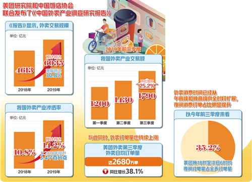 当前,持续快速增长的外卖市场成为国内餐饮业的一大亮点,同时也成为消费升级的一大推动力。外卖的发展,不仅方便了百姓生活,也推动了餐饮产业内部线上线下的融合发展,拓宽了消费应用场景,创造了大量就业机会,为整个餐饮行业发展注入了新动能—— 近日,美团研究院和中国饭店协会联合发布了《中国外卖产业调查研究报告》。《报告》显示,在2018年交易额4613亿元的基础上,2019年外卖规模预计将达6035亿元,增幅将达30.8%,外卖产业的快速发展为整个餐饮行业注入了新动能。 市场规模持续提升 数据显示,2019年前三季度,我国外卖产业交易额分别为1200亿元、1430亿元、1790亿元,第三季度环比增长25.2%。与此同时,外卖订单量也持续上涨。以美团外卖为例,第三季度,美团外卖日均订单量达2680万单,同比增长38.1%。订单量的持续增长表明,外卖在消费中的作用进一步凸显,且外卖市场仍有巨大的增长潜力。 随着市场规模的持续快速增长,外卖产业的渗透率继续提升。2018年,我国外卖产业的渗透率为10.8%,到2019年第三季度,外卖产业的渗透率提升至15.9%。预计,2019年全年外卖产业渗透率将达14.2%,相比2018年提升3.4个百分点。 从消费品类情况来看,餐食仍是外卖订单的主要消费品类。基于餐饮外卖用户习惯养成的同时,又催生出很多非餐品的配送场景和需求。如今,随着配送效率的不断提升,外卖服务已经从餐饮美食外溢到生活超市、生鲜果蔬、鲜花绿植、美妆、日用品、服饰鞋帽和母婴产品等多个生活场景,甚至实现了全时段配送服务。通过外卖满足甜品和水果等日常性需求、蛋糕和鲜花等节日性需求,也正在成为国民新的消费习惯。 夜经济是城市活力的晴雨表。在外卖品类越来越丰富、配送越来越快捷、商户主动延长营业时间等因素的共同作用下,外卖消费时间已经从午高峰和晚高峰向全时段扩展,夜间消费订单占比明显提升。以今年前三季度来看,美团18时至次日6时的订单量占全天订单量的35.2%。 从餐饮向非餐饮跨越,是外卖产业快速增长的重要原因。中国连锁经营协会副秘书长王洪涛分析认为,得益于技术的升级和多场景跨越,餐厅信息、评价及交易不断迁移到互联网和手机端,让越来越多的新消费需求变为可能,共同推动了外卖产业发展壮大。 生态边界不断扩大 “近年来,在技术发展和消费升级态势下,外卖正在从一个新模式升级为新业态。”美团研究院院长来有为分析说,外卖正从餐饮的“线上渠道”升级成为餐饮企业提升经营能力的必要手段。 比如,对于庆丰包子铺、护国寺小吃等这样的中华老字号品牌来说,上线外卖服务并非易事。 “护国寺小吃向来以店食为主,一开始对互联网外卖这种新业态保持非常谨慎的态度。直到不少年轻人打电话咨询能不能送外卖,才选择上线外卖服务。”北京华天京韵护国寺餐饮管理有限公司总经理曹淑琴告诉记者,开展外卖业务带来的最大惊喜就是拓展了门店的覆盖范围,挖掘了很多潜在用户。据统计,护国寺小吃外卖在营收中占比从最初的2%左右,已增长到12%。 外卖产业在快速发展中,也呈现出不少新趋势。比如,合理的膳食搭配就是其一。据统计,2019年前三季度,美团外卖轻食订单量同比增长102%,轻食作为一种健康饮食方式正受到越来越多消费者的欢迎。对此,美团高级副总裁兼到家事业群总裁王莆中表示,美团一方面联合政府、媒体、专业机构等聚合专业营养健康知识,另一方面通过对商户的经营指导加强对健康餐饮的知识普及,促进轻食、健康餐、儿童餐等多样化人群供给的蓬勃发展。 “经过多年发展,外卖正成为全时段、跨品类的消费场景,为餐饮和零售行业带来红利。”来有为表示,外卖以用户的即时洞察为核心,以大数据为驱动,围绕着本地生活服务平台打通线上和线下消费场景,线上实现交易闭环,线下通过即时配送完成交易履约,从而为更多用户提供从需求发起到商品验收的一站式服务。 行业潜力仍待释放 外卖产业的持续快速增长,不仅方便了民众生活,也推动了我国餐饮产业线上线下融合,拓宽了消费应用场景,创造了以外卖骑手、外卖配送站工作管理人员、外卖配菜人员、外卖运营规划师、线上餐厅装修师为代表的大量就业机会,为我国餐饮行业发展注入了新动能。 “可以说,我国外卖产业新业态发展仍有很大潜力。”王洪涛表示,一方面是因为我国的市场很大,特别是下沉市场还有很大发展空间;另一方面是随着互联网技术的发展,外卖会逐渐实现智慧化、个性化、专业化,这将是一个巨大的消费增量。 一组数据也充分印证了这一观点。据统计,目前,外卖用户数量只占网民用户总数的49%,接入互联网餐饮服务平台的餐厅只占我国餐厅总数的40%左右,不少中西部地区和三四线城市的外卖业务才刚刚起步。 随着竞争日益激烈,获客难成为困扰很多餐饮企业的一大难题。业内专家表示,餐饮企业要畅通线上线下渠道,整合线上线下资源,打造覆盖更多场景的整合营销方案。 “过去5年,外卖生态边界不断扩大,形成了一个在平台基础上连接用户、商户及配送,辐射供应链、共享厨房、外卖代运营等多元化服务的生态体系。”王莆中分析说,未来5年,美团将助力千万商家,打造“下一代门店”。 所谓“下一代门店”,就是把原来以店食为主的门店,通过软硬件改造和经营管理模式迭代,升级为同时具备线上