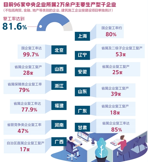 近日,各地国资监管机构深入学习习近平总书记关于一手抓疫情防控、一手抓经济社会发展的重要指示精神,按照国务院国资委党委工作要求,作出了一系列紧锣密鼓的安排,确保各地国企在抓好疫情防控的前提下,有序推进企业复工复产,努力把疫情带来的不利影响降到最低,全力以赴保持生产经营稳定运行。 经济日报记者从国务院国资委获悉,据不完全统计,截至2月12日,全国各地国企已实现大面积复工复产,其中涉及民生保障的各地国企在春节假日期间也保持了良好运转。 北京: 国企复工率99.7% 目前,北京市国资委系统各单位均实现复工复产,北京国企正在为全市经济社会发展和城市稳定运行作出重要贡献。据统计,截至2月12日18时,北京43家市管企业集团总部已全面复工;二级及重要子企业1089户,复工复产比例99.7%。 2月8日,由北京建工集团施工的国家会议中心二期工程正式复工。国家会议中心二期工程是冬奥工程,为保证这项市重点工程不受疫情影响,项目部积极推进工程复工,首批190余名体检合格的员工已开始有序进入现场开始作业。北投集团承担的北京城市副中心剧院、图书馆、博物馆三大建筑项目于9日全面复工,城市绿心、棚改安置房以及冬奥村等重点项目工程也将陆续复工。 上海: 国企复工率约80% 上海市国资委有序落实国有企业复产复工,统筹推进经济社会发展各项任务。立足企业需求,提供各方面支持政策,在抗疫资金安排、员工权益维护、金融企业支持实体企业、优化考核评价等方面给予企业支持托底,全面梳理中央和本市在疫情防控期间支持服务企业发展的各类政策,指导帮助企业用足用好扶持政策。 截至2月12日,上海市国资系统监管企业本市地域内正式职工复工约70万人,其中居家办公约10万人,复工率约80%。 山西: 省属企业复工复产28家 山西省国资委坚持防控疫情和复工复产两手抓,企业正常运营和新项目开工建设两手抓,在严格落实疫情防控措施的同时,做到省属国企生产经营各项工作不停摆、不迟滞、不耽误。春节期间,山西省属国企各级子企业中,有涉及能源供应、重大民生保障类企业如煤炭、焦化、化工以及电力、高速公路、民航运输保障、供气供暖等企业共144户连续生产。 截至2月6日,在涉及“三必需一重要”的省属二级企业当中,有66座煤矿、4户化工企业、8户煤机、物流等煤炭生产配套企业已经复工。28家省属一级企业中,文旅集团、山煤集团、大地控股、国控集团、汾酒集团等9户企业在2月9日后陆续恢复生产经营。随着8座煤矿、3户化工厂、7户矿业公司和1户乳制品生产企业等省属国企陆续复工,截至2月11日24时,28家山西省属企业的1000余户法人单位实现复产复工。 辽宁: 省属及二级子企业复工53家 近日,辽宁省国资委印发《关于应对新冠肺炎疫情支持省属企业生产经营若干政策措施的通知》,出台10条政策措施,在开工复工、业绩考核、工资总额、研发支出、融资支持、一线职工福利等方面,指导和推动省属企业积极应对疫情、组织开工复工,确保疫情防控和企业发展两不误。 截至2月11日15时,辽宁省属企业及所属二级子企业复工复产53家,新投入一线职工8744人,日在岗人数达9万人。据了解,14家市属企业及所属二级子企业复工复产企业89家,新投入一线职工20465人,日在岗人数达8.9万人。 浙江: 省属保障类企业复工率79% 浙江省国资委和省属企业扛起责任、强化担当,全力保障医疗物资、民生必需品、能源供应和交通运输畅通,为打赢疫情防控阻击战提供有力支持。一方面,将在前一段防疫和生活保障相关企业复工基础上,坚持受控复工,因地因时、分类有序地推动企业复工复产,支持疫情防控重点企业扩大生产,并继续组织企业做好防控物资、生活物资保供;另一方面,通过建立企业复工应急协调机制,把疫情防控和复工复产作为深化“三服务”以及省国资委“双进双促”的重点任务,深入一线了解企业需求和困难,指导企业用好用足相关政策,一企一策研究指导帮扶举措。 截至2月12日,浙江省属企业中涉及保障公共事业运行、疫情防控、群众生活及其他涉及重要国计民生的十类保障性企业复工率已达79%。 安徽: 省属企业复工复产25家 安徽省国资委在组织省属企业做好疫情防控工作的同时,强化统筹、分类指导省属企业复工复产,对省属企业复工风险评估、复工方案制定、复工前风险隐患排查、职工返程服务管理、落实生产生活各类场所疫情防控管理制度、开展健康监测和应急处置等细化部署,指导省属企业健全完善领导值班、疫情日报告、零报告等各项制度,进一步落实企业主体责任和主要负责人第一责任人责任。做到疫情防控和生产经营“两手抓、两不误”。 截至2月13日,安徽26家省属企业已有25家实现复工复产,二级公司复工复产面超过60%,达到242个,复工人数达到16.4万人。其中,省交控集团、省能源集团、淮河能源集团、华安证券公司、省国控集团、机场集团6家企业及所属二级公司实现全面复工复产。复工复产面较小的文体旅游、餐饮住宿等业务板块和建筑施工项目,将在行业部门和属地组织安排下,分步复工复产。 福建: 省属企业复工率达77.9% 福建省国资委指示所有省属企业做到“转产扩产保防控,复工复产保经济”,要求全省国资系统强化组织保障,因地制宜、创新举措,实施一企一策、一项目一策,梳理疫
