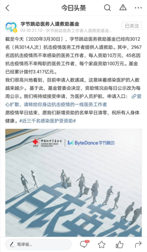 随着新冠肺炎疫情在全球蔓延,3月25日,字节跳动医务救助基金宣布将中国援外抗疫医疗队纳入保障范围,资助标准和此前一致:因援外抗疫不幸感染的医务工作者,每人资助10万元人民币;因援外抗疫而不幸殉职的医务工作者,每个家庭资助100万元人民币。
