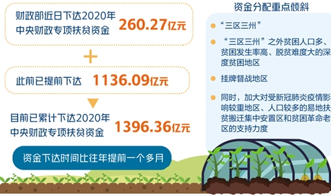 2020年是脱贫攻坚的决战决胜之年。打赢脱贫攻坚战,资金保障是关键。今年中央财政专项扶贫资金比往年提前了一个多月下达,不仅投入力度持续加大,而且针对脱贫攻坚“硬骨头”予以资金倾斜,并充分考虑新冠肺炎疫情的影响,全力推动提高资金使用效益,力争把每一分钱用在刀刃上。 如期高质量打赢脱贫攻坚战,资金保障十分重要。近日,财政部下达各地2020年中央财政专项扶贫资金260.27亿元,加上提前下达的资金,目前已累计下达2020年中央财政专项扶贫资金1396.36亿元,下达时间比往年提前一个多月。 记者从财政部获悉,2020年,财政部将继续落实好脱贫攻坚投入保障政策举措,持续健全与脱贫攻坚任务相适应的投入保障机制,为打赢脱贫攻坚战提供充足的“粮草军需”。 投入力度持续加大 到2020年现行标准下的农村贫困人口全部脱贫,这是党中央向全国人民作出的郑重承诺,必须如期实现。 财政部坚决履行脱贫攻坚政治责任,坚持将脱贫攻坚工作摆在突出位置,资金安排上予以优先保障。财政部农业农村司负责人介绍,根据财政部2020年财政脱贫攻坚工作安排,在脱贫攻坚投入保障方面将采取以下举措。 统筹多渠道资金来源,保持投入总量增长。财政部落实与脱贫攻坚任务相适应的投入保障机制要求,统筹考虑完成最后攻坚任务和巩固脱贫成果等因素,围绕补齐“两不愁三保障”突出短板,在加大中央财政投入的同时,督促指导相关省份加大脱贫攻坚投入力度。 “2020年中央财政专项扶贫资金规模将继续大幅度增加,新增资金重点向‘三区三州’等深度贫困地区、挂牌督战地区倾斜,兼顾人口较多的易地扶贫搬迁集中安置区。”上述负责人表示。 此外,对已经实现稳定脱贫的地方,各地可统筹安排专项扶贫资金,支持非贫困县、非贫困村的贫困人口脱贫。切实用好城乡建设用地增减挂钩节余指标跨省域调剂及跨省域补充耕地政策,支持脱贫攻坚和乡村振兴。 突出政策支持导向,不断优化投入结构。在中央财政继续加大对“三区三州”等深度贫困地区支持力度的同时,督促地方各级财政加大资金和政策倾斜力度,突出支持“三区三州”等深度贫困地区脱贫攻坚,支持对工作难度大的县和村实施挂牌督战。 加强与行业部门的协调配合,坚持现行脱贫攻坚目标标准,大力支持解决义务教育、基本医疗、住房安全、饮水安全等方面存在的突出问题。 完善政策支持体系,增强政策实施的精准性和有效性。近年来,我国持续推进贫困县涉农资金整合试点,取得突出成效。“要保持脱贫攻坚期内整合试点政策总体稳定,发挥各级整合工作协调机制的作用,加强部门间沟通协作,督促省级指导贫困县进一步提高整合资金用于产业项目占比,提升整合资金的脱贫成效。支持实施优势特色农产品保险以奖代补政策,优先支持地方尤其是贫困地区和贫困人口特色农业产业发展。”财政部农业农村司负责人说。 应对疫情不利影响 突如其来的新冠肺炎疫情,对经济社会造成冲击。在抓好疫情防控工作的同时,特别要抓好涉及决胜全面建成小康社会、决战脱贫攻坚的重点任务。 “新冠肺炎疫情发生以来,财政部密切关注和持续跟踪疫情对脱贫攻坚造成的影响,特别是针对疫情对农畜产品产销对接、贫困地区劳务输出的影响和因疫情致贫返贫情况,会同相关部门,研究出台了涉及脱贫攻坚的财力保障、财政补助、税费优惠、金融保险等多方面政策措施。”财政部农业农村司负责人表示。 据悉,在财力保障方面,2020年中央财政将继续较大幅度增加专项扶贫资金规模,向湖北等受疫情影响较重地区适当倾斜。同时,中央财政在测算分配2020年农业生产发展资金等转移支付时,将向湖北等疫情防控重点地区倾斜,适当加大资金支持力度,促进恢复农业生产。通过农业生产救灾资金,支持水稻、小麦等农作物重大病虫害和草地贪夜蛾防控,对湖北省适当倾斜并对其蔬菜病虫害防控适当支持保障“菜篮子”。 此外,各地可在2019年至2020年服务业发展资金支持农商互联工作事项中合理安排一定比例资金用于支持疫情防控期间农产品市场保供,具体支持货源组织、储备和对接调运,相关资金不受原有政策规定的资金用途比例限制。 “在调整和优化财政专项扶贫资金使用范围方面,督促指导各地结合实际,按照精准施策的要求,在现有资金管理制度框架内,调整和优化财政专项扶贫资金使用,研究制定针对受疫情影响较重地区脱贫攻坚的支持政策。”财政部农业农村司负责人介绍,要重点向产业项目倾斜,结合实际加大对受疫情影响较大的产业扶贫项目生产、储存、运输、销售等环节的支持,解决农产品“卖难”问题;通过一次性生产补贴、贷款贴息支持、临时岗位补助等,支持企业带动贫困户就业。 就业是最大的民生,财政政策与就业政策协同发力。“促进就业是一项根本之举,要把相关资金更多用在提高人力资本上,加大就业培训、技能提升等方面。”中国财政科学研究院副院长白景明说。 据悉,在加大稳岗返还和就业补助资金投入力度方面,国家允许地方统筹使用就业补助、失业保险基金结余、职业技能提升行动专账等资金,支持地方落实国家的各项就业政策,做好贫困劳动力就业创业工作。 同时,财政部继续配合相关部门扶持发展扶贫车间、农业合作社和产业大户,吸纳贫困劳动力就业。对有创业