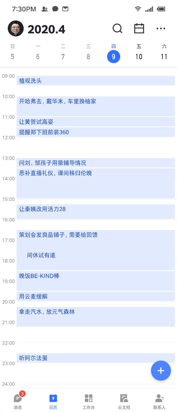 罗永浩在微博上表示,“@飞书 这个日历做得不错,我一天的计划都在这儿了”。日历上从早到晚排满了日程,并出现了不少产品品牌名。如,9号下午1点半到2点半之间,是“恶补直播礼仪”;4点半到5点,是开策划会。