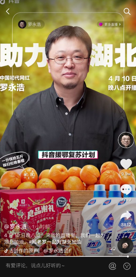 除飞书日历曝光的选品外,今日早些时候,罗永浩还通过短视频透露,将在新一期直播中为湖北进行义卖。他表示,团队联合“抖音援鄂复苏计划”,用首期直播打赏收到的360万元,采买了一些秭归伦晚春橙,将在4月10号的直播当中,以1分钱5斤的包邮价“白送”给用户。