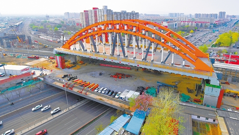 4月9日,跨越京沪铁路和北京西四环路的北京丰台特大桥六线简支钢箱拱桥落梁完成,标志着由中铁六局承建施工的丰台火车站改建配套控制性工程——全国首座六线简支钢箱拱桥顺利完工,为丰台站改建工程后续施工奠定了坚实基础。