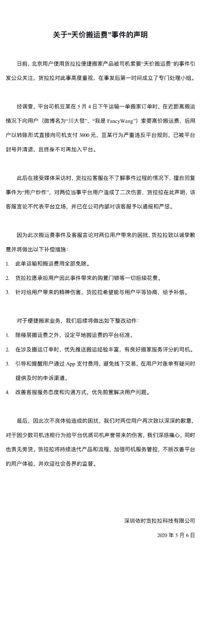 中新网客户端5月7日电 日前,有网友爆料称在北京约货拉拉搬家,不到两公里的距离被收费5400元。5月6日晚,货拉拉发布关于“天价搬运费”事件的声明称,涉事司机行为严重违反平台规则,已被平台封号并清退,且终身不可再加入平台。同时通报和严惩擅自称“用户炒作”的 客服。此外,免除用户此单运输和搬运费用,针对给用户带来的精神伤害,货拉拉希望能与用户平等协商,给予补偿。