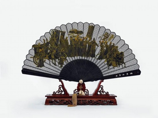 黑檀浅刻描金扇《贵妃出巡图》 宽122cm 厚8cm 高64cm 中国工艺美术大师 邢伟中 第六届中国工艺美术大师作品暨工艺美术精品博览会“百花杯”金奖 另一把同样是仕女主题的檀香扇《琴棋书画》,以细腻、浑厚的烫烙技法精心绘制了一幅对弈、抚琴、读书、作画的场景,整扇布局紧凑人物娇媚生动。