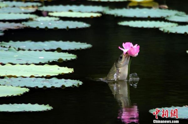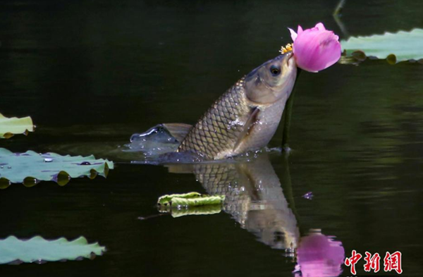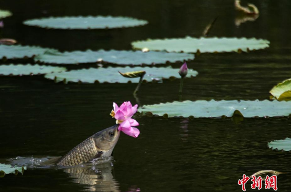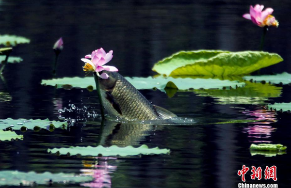 7月3日,在成都工业学院一荷塘里上演“鱼吃荷花”景观,鱼儿围绕荷花游动,不时地跃出水面撕咬荷花,场面生动有趣。中新社记者 王磊 摄