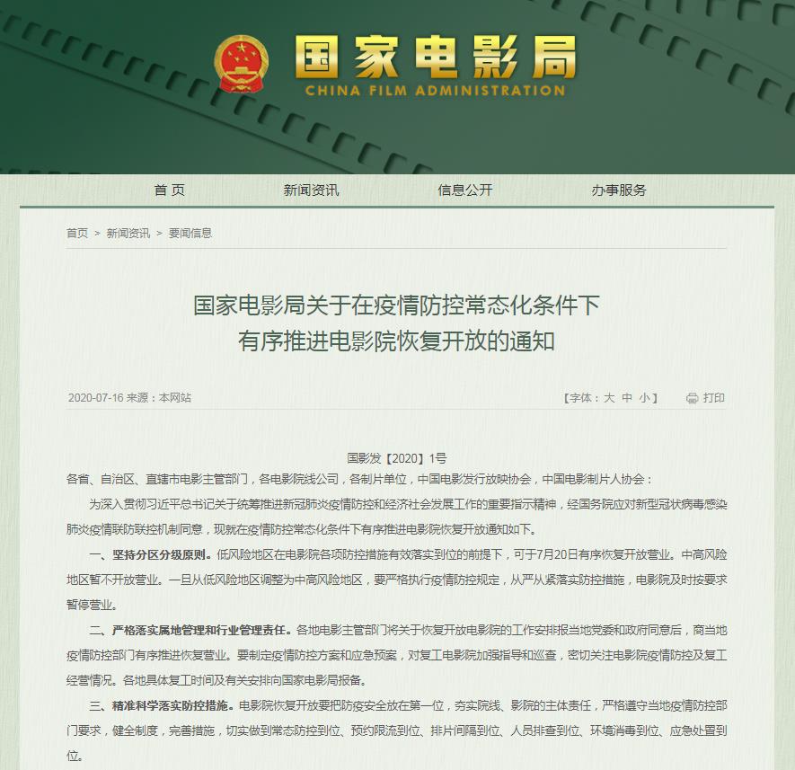 通知提出三个要求。一是坚持分区分级原则。低风险地区在电影院各项防控措施有效落实到位的前提下,可于7月20日有序恢复开放营业。中高风险地区暂不开放营业。一旦从低风险地区调整为中高风险地区,要严格执行疫情防控规定,从严从紧落实防控措施,电影院及时按要求暂停营业。