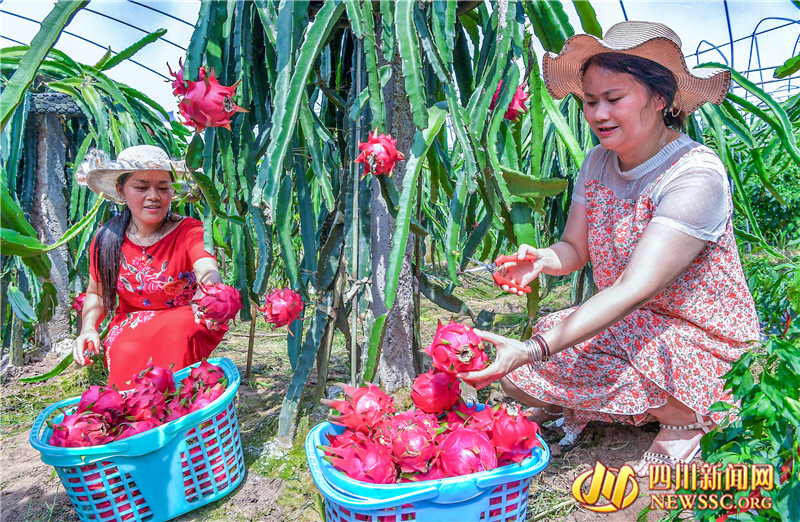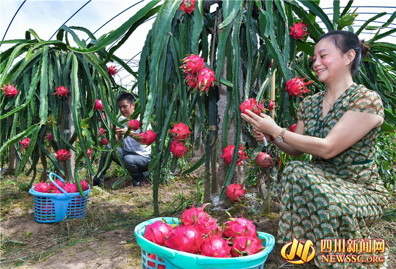 四川新闻网消息(田祖国 张国盛 文/图)7月29日上午,在广安区大龙镇太山村金睿生态农场,一个个红艳艳的火龙果吊在碧绿的枝条上,10多名游客正兴致勃勃地品尝和采摘火龙果。“早听说这里种植有生态火龙果,我专门过来采摘购买30来斤,拿回去和家人、朋友一起分享。”从城区驱车来到基地的市民罗陈兰说道。
