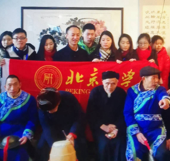 远道而来的游客与非遗复兴锣鼓表演者合影
