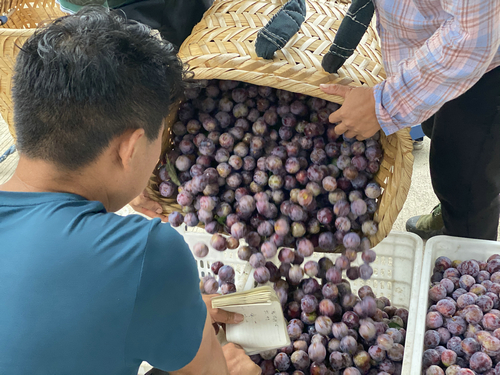 “我家一共种了二十多亩李子,预计今年采摘应该有六万斤左右。我们每天采摘回来就在交易市场这儿进行售卖,每天来就只用把果子选好,大的大果选好,中果选好, 选好来过后老板就在这儿给我们装车,非常方便。在销路这方面我们老百姓是一点都不愁。”