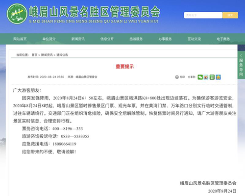 四川新闻网消息(记者 李举涛)8月24日上午,据峨眉山景区管委会通报:因突发强降雨,当天6时50左右,峨眉山景区峨洪路K8+800处出现边坡落石,为确保游客游览安全,当日8时起,峨眉山景区暂时停售景区门票、观光车票,并在黄湾门禁、万年路口分别实行临时交通管制,过往车辆请绕行。