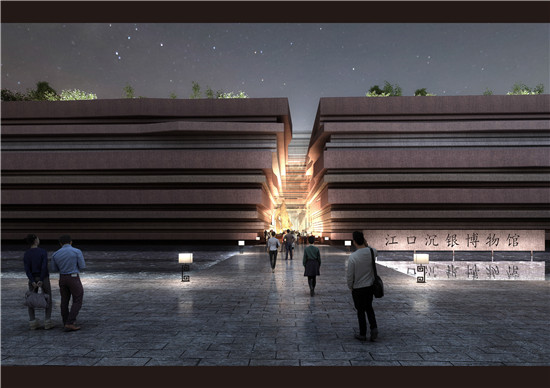 江口沉银博物馆在总体设计上引入考古现场“地质分层”的概念,巧妙地将建筑与周边环境及当地文化特点融合在一起。依据整个地块规划轴线作为导向设计,作为入口主轴线;将博物馆入口及主要空间打造成具有考古岩层的质感的洞穴体验空间。借鉴江口沉银故事中,非常重要的元素“水”,将建筑设计以漂浮在水面的姿态与周边景观及水系发生对话。总体布局为清晰的两部分,东侧为博物馆主要展览空间,西侧作为办公研究等内部空间;并设计了屋顶花园,整体融于景观之中。