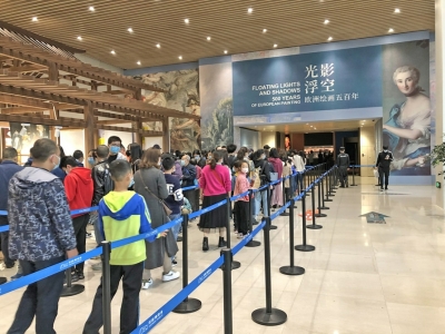 长假期间,成都的博物馆门前,观众排队入场的热闹场面。