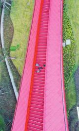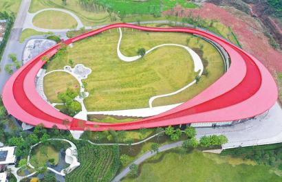 11月6日,俯瞰位于成都市天府大道兴隆湖畔的“智慧之环”,红色的环形屋顶跑道与绿草坪、楼房相映成趣。 11月初,“智慧之环”屋顶红色跑道和草坪区域对外开放。红色的塑胶跑道随着屋顶的曲面高低起伏,中间环绕一个绿意盎然的公园,市民可通过两个出入口从地面一路漫步到屋顶,在这条长达698米的跑道上奔跑。据了解,“智慧之环”环状造型和曲线呼应了成都平原周边环绕的山脉形态。屋顶为金属曲面,由1.52万片铝板拼接而成;立面为玻璃曲面。四川日报全媒体记者 李向雨 摄
