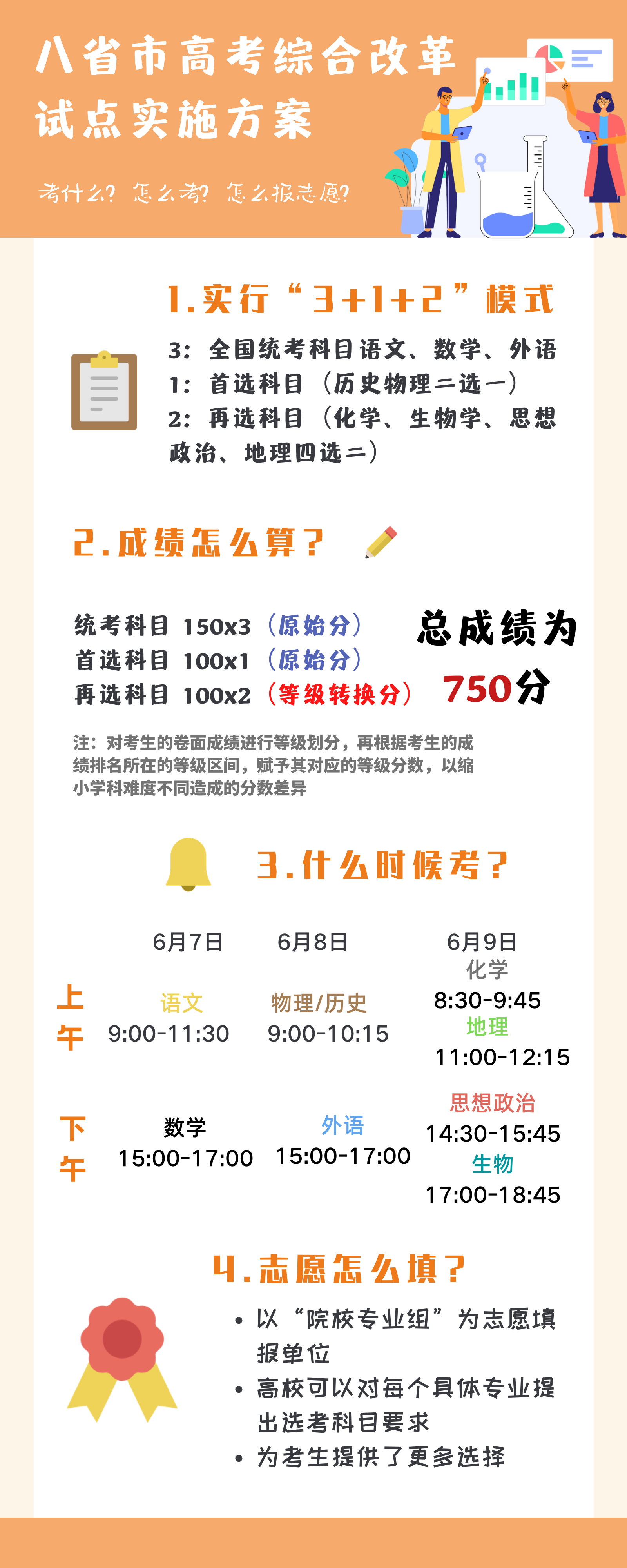 这八个省市作为全国第三批高考综合改革省市,将在2021年高考实行“3+1+2”模式,包括国家统一高考语文(汉语)、数学、外语(含笔试和听力)3门科目,及考生自主选择的普通高中学业水平选择性考试3门科目。