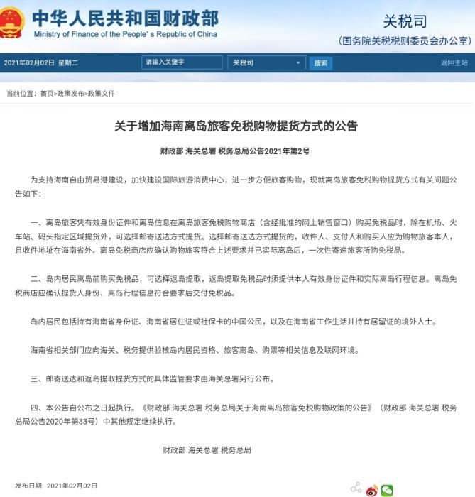 中新网客户端2月2日电 2日,财政部、海关总署、税务总局公布《关于增加海南离岛旅客免税购物提货方式的公告》,增加离岛旅客邮寄送达、岛内居民返岛提取两种提货方式。离岛旅客凭有效身份证件和离岛信息在离岛旅客免税购物商店(含经批准的网上销售窗口)购买免税品时,除在机场、火车站、码头指定区域提货外,可选择邮寄送达方式提货。岛内居民离岛前购买免税品,可选择返岛提取。增加新的提货方式后,能够有效解决离岛旅客提货排队时间长、随身携带不便等问题,大幅提高旅客购物便利度。