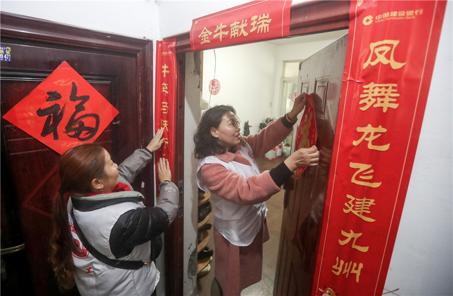 | 2月4日, 四川省华蓥市的义工在为“中国好人”称号获得者许前政家贴春联,在喜气祥和中欢度小年。 |