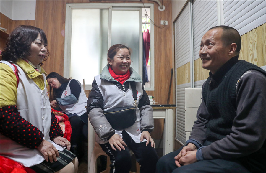 | 2月4日, 四川省华蓥市的义工与“中国好人”称号获得者许前政(右一) 交谈,祝福他一家人新春快乐。 |