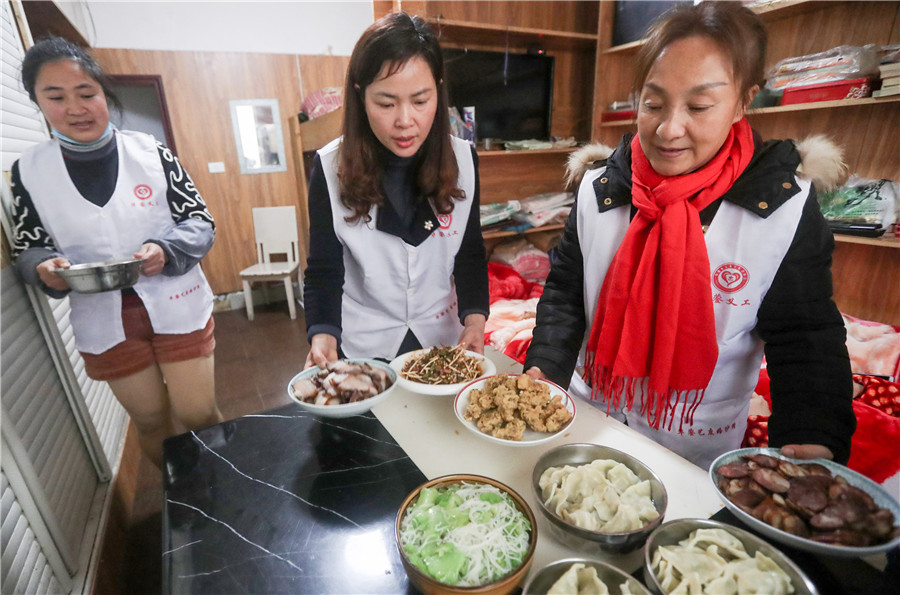 | 2月4日, 四川省华蓥市的义工在为“中国好人”称号获得者许前政一家人端送刚做好的过小年食用的菜肴。 |