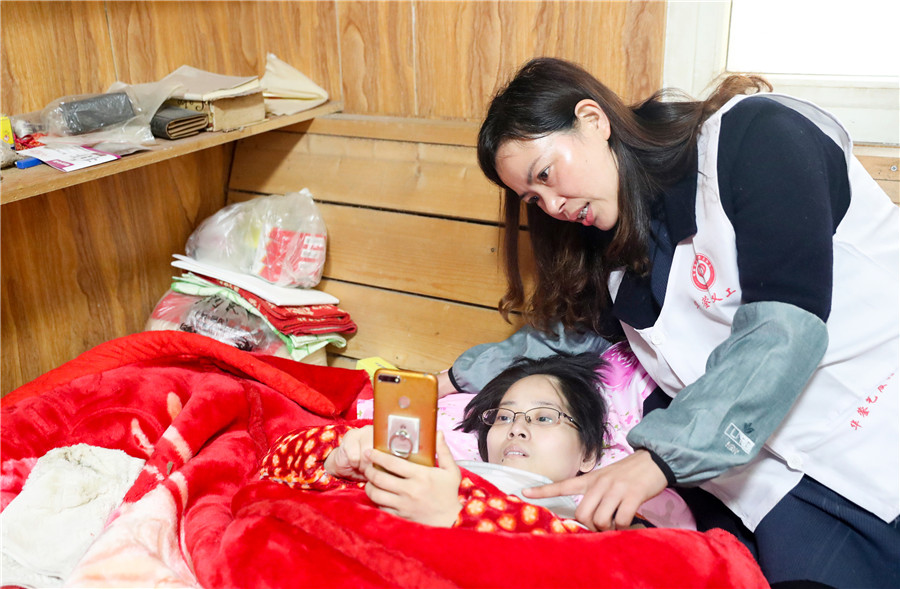 | 2月4日, 四川省华蓥市的义工在“中国好人”称号获得者许前政家中,陪伴长期卧床的许小娇浏览手机。 |