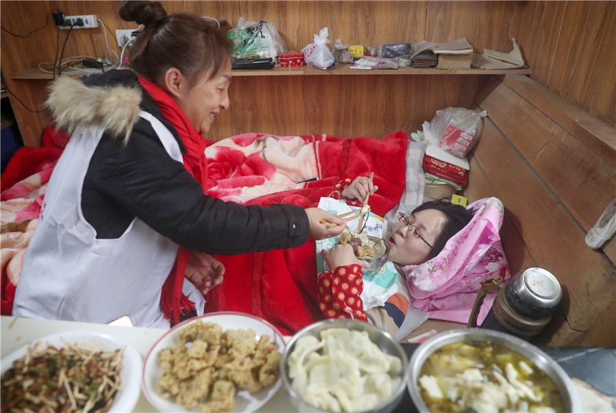 | 2月4日, 四川省华蓥市的义工在“中国好人”称号获得者许前政家中,给长期卧床不起的许小娇添夹过小年食用的菜肴。 |