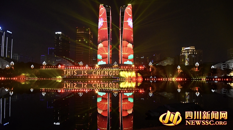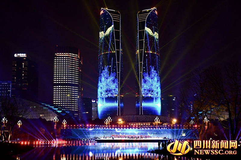 四川新闻网成都2月23日讯(记者 何佳欣 胡旭阳 摄影报道)夜幕降临,华灯初上,交子公园灯火璀璨、流光溢彩,声、光、电、影、水与湖面、双子塔交相辉映。露天实景新春元宵晚会2月22日在成都交子公园精彩上演。