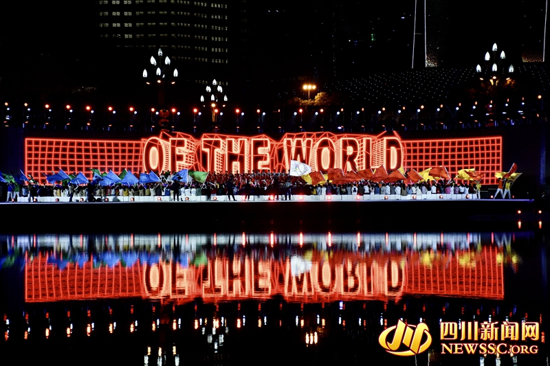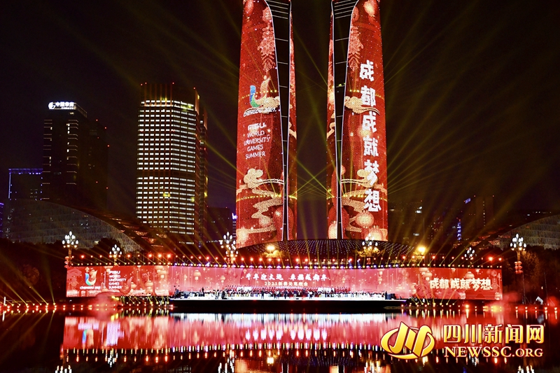 作为成都网红地标,成都天府国际金融中心双子塔上抢镜的“爱成都,迎大运”标语,随着音乐变幻的时尚灯光秀与搭建在明镜般湖面上的舞台遥相呼应。这样一种颇具匠心的设计结合了“公园”与“城市”的特色,融合出自然与艺术的美感。