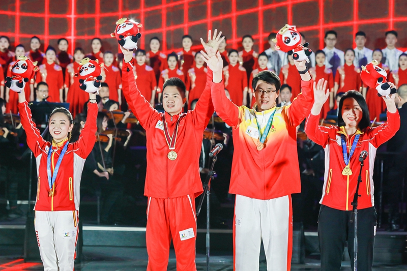 曾荣获世界大学生运动会冠军的运动员登台亮相(成都大运会执委会供图)