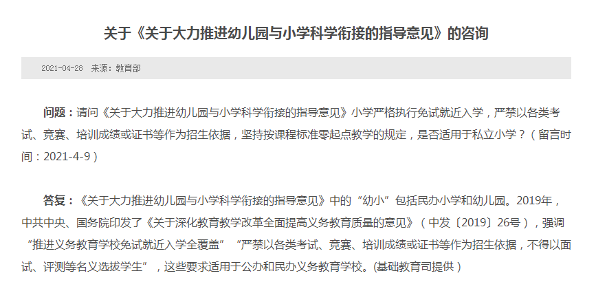 新华网北京4月28日电 近日,教育部在回应网友咨询《关于大力推进幼儿园与小学科学衔接的指导意见》相关问题时表示,该指导意见中的“幼小”包括民办小学和幼儿园。2019年,中共中央、国务院印发了《关于深化教育教学改革全面提高义务教育质量的意见》(中发〔2019〕26号),强调“推进义务教育学校免试就近入学全覆盖”“严禁以各类考试、竞赛、培训成绩或证书等作为招生依据,不得以面试、评测等名义选拔学生”,这些要求适用于公办和民办义务教育学校。