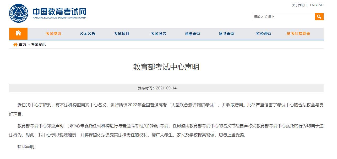 教育部考试中心郑重声明:未委托任何机构进行与普通高考相关的调研考试,任何盗用教育部考试中心的名义或擅自声称受教育部考试中心委托的行为均属于违法行为,对此,教育部考试中心中心予以强烈谴责,并将保留依法追究其法律责任的权利。请广大考生、家长及学校提高警惕,切勿上当受骗。